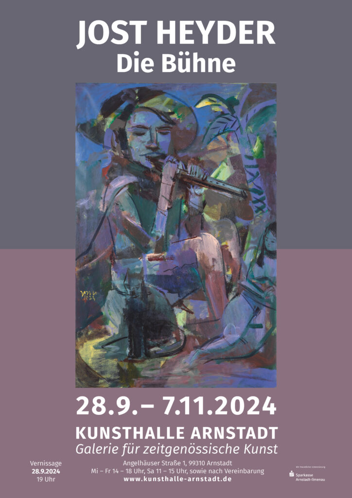 Jost Heyders Bilder sind bevölkert von Käuzen und Sonderlingen jeglicher Couleur, von Masken und Harlekins, von mythischen und literarischen Figuren, von Phantasiegestalten und seltsamen Getier, sie alle eingespannt in räumliche Situationen, die Bühne und Atelier zugleich sind, Schau-Plätze im Wortsinne, sie alle im scheinbaren Nebeneinander agierend und doch auf geheimnisvolle Weise miteinander verbunden.